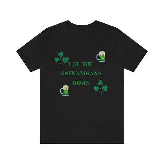 Let the shenanigans begin, St Patty's day, Irish, Clover, Shamrocks, Green Beer, Saint Patricks Day Tee, Beer, Unisex Short Sleeve Tee