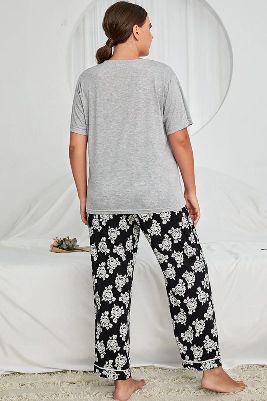 Plus Size V-Neck Tee and Floral Pants Lounge Set